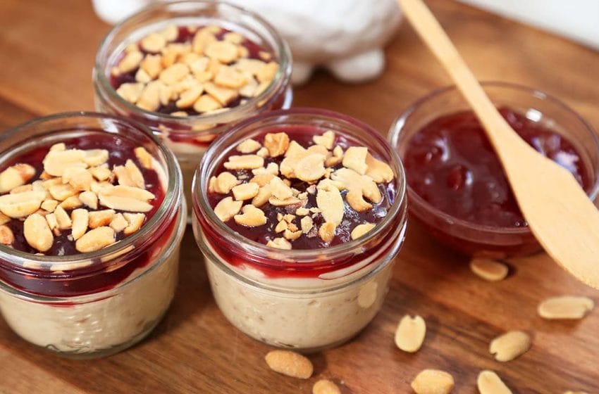 In a small bowl mix yogurt and peanut butter until they become smooth. Top with jam and some crushed peanuts.