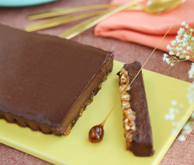 When I came across this recipe it was one that I just had to share with you as it is a no bake tart with that creamy chocolate filling and a crunch base from the almond brittle which this recipe will teach you how to make as well