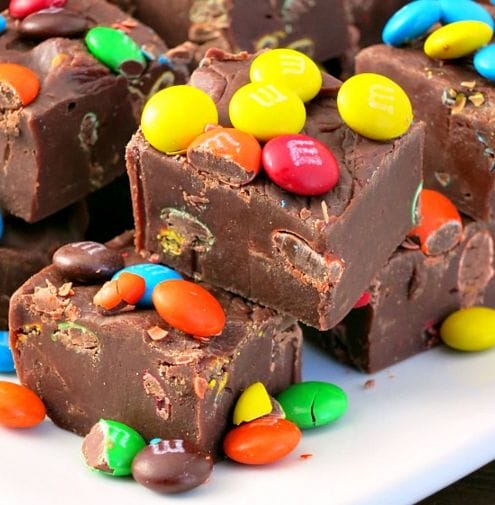 This Easy M&M Fudge recipe is a delicious chocolate fudge studded with M&M candies made in minutes using only three ingredients