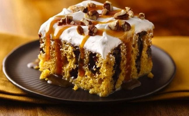 I love poke cakes as they are so easy to make and are great for that family or friends gathering where they will be a great hit , so I was looking for that perfect poke cake For Thanksgiving to share with you and I came across this recipe for a caramel drizzled pumpkin poke cake recipe from betty crocker website that is just perfect