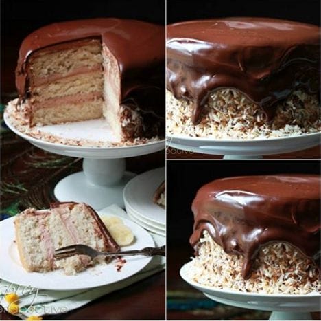Banana Coconut Cake layered with Whipped Chocolate Frosting and Chocolate Ganache