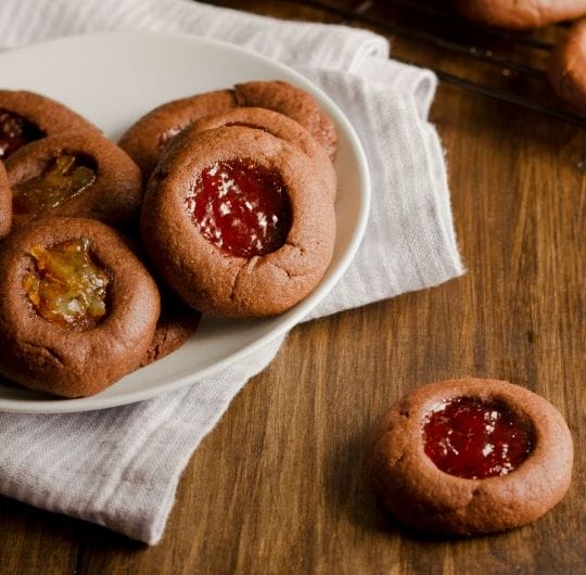 Thumbprint cookies are staple on holiday cookie plates. These cookies take the thumbprint to a new level with a chocolate-y, coffee flavor and a bright, fruity center.