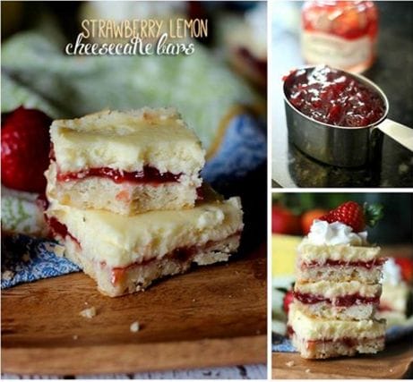 I am obsessed with these Strawberry Lemon Cheesecake bars! Creamy lemony cheesecake on top of a buttery shortbread crust with strawberry preserves sandwiched in between!