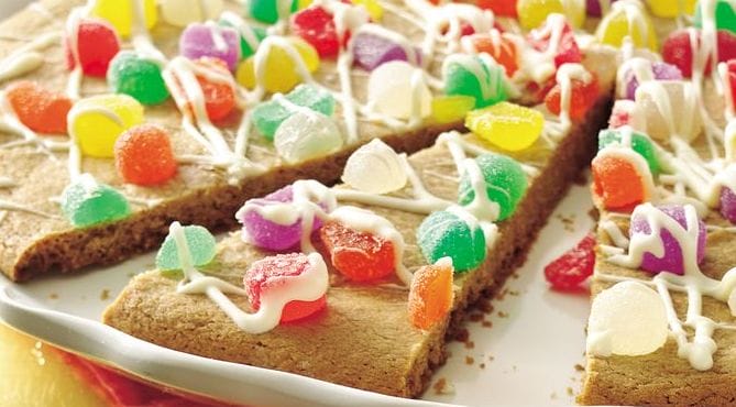 Colorful cookie crust pizza topped with gumdrops and chocolate is ready in just an hour – perfect for dessert.