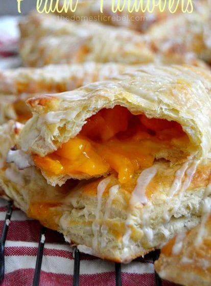 These Peach Turnovers are a cinch to make when you use pie filling!RECIPE HERE: http://thedomesticrebel.com/2015/07/13/the-easiest-peach-turnovers/