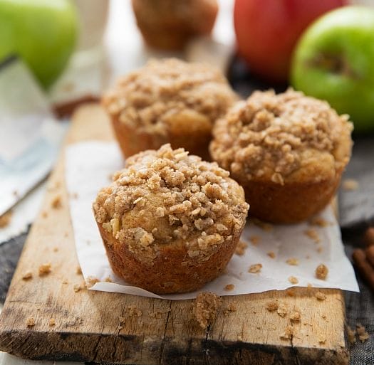 These apple pie muffins are made healthier with Greek yogurt, coconut oil, and whole wheat flour. Plus these muffins have an optional cinnamon oat crisp on top made without butter!