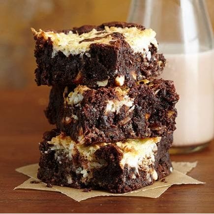 Dollop a mixture of shredded coconut and sweetened condensed milk on brownie batter for a fun flavor variation on traditional fudge brownies.