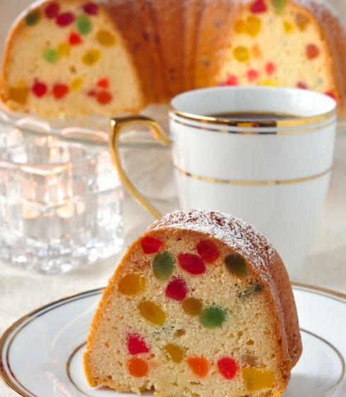 Gumdrop Cake – a dense buttery pound cake packed with brilliantly colored morsels of gumdrop candy. It’s very popular during the Holidays or as a birthday cake here in Newfoundland