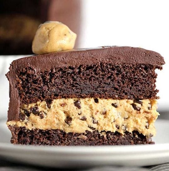 Can’t decide between cake and cookies? Have both with this Double Chocolate Peanut Butter Chocolate Chip Cookie Dough Cake!
