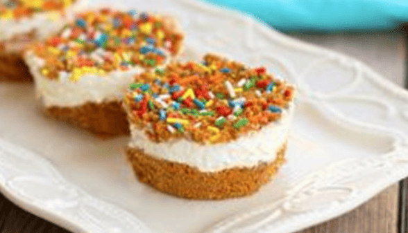 Individually portioned cheesecakes filled with a light and creamy filling and sandwiched between layers of buttery crushed Golden Grahams™.