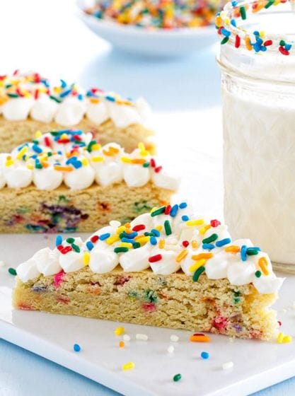 You can jazz Funfetti Sugar Cookie Bars up by cutting them into shapes like triangles, circles and sticks, or traditional squares. And they are totally adaptable; just add in a little spice or citrus zest and top them with a flavored buttercream and you can create a sweet and seasonal dessert that everyone will be raving about.