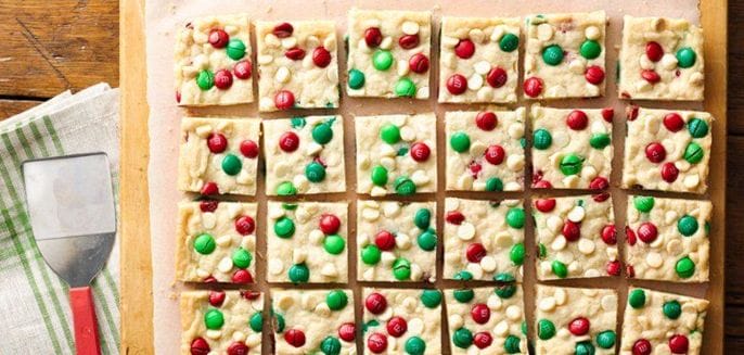 This bar is perfect to round out your cookie exchange — colorful holiday chocolate candies, white vanilla baking chips and sugar cookie mix makes this a snap to make and bake.