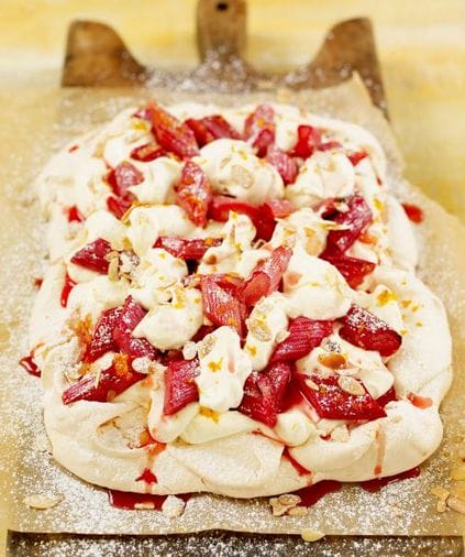 One of those great summer desserts is this meringue recipe that has rhubarb and fresh cream with a sprinkle of toasted almonds. how delightful,